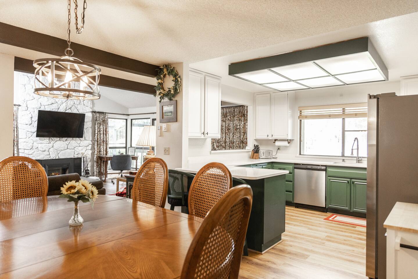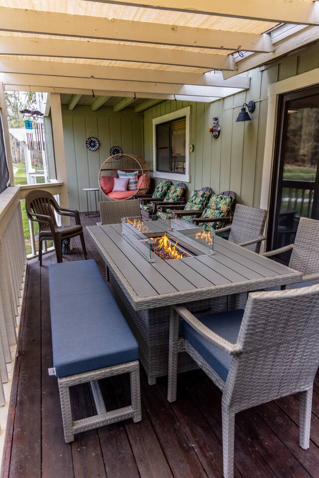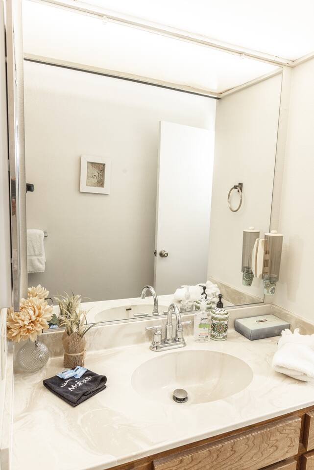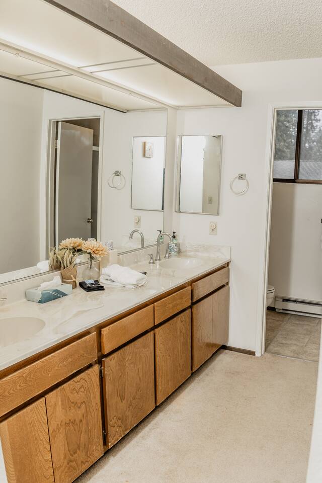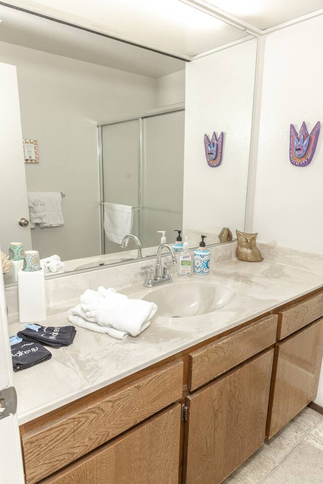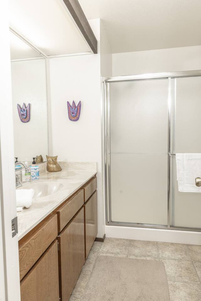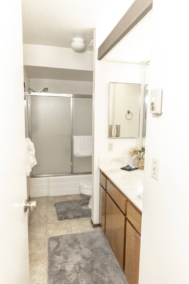 Our family has been enjoying making memories here, and we hope to share some of those same joys with you. As you enter you will be welcomed into the open living room, which connects to the deck, dining room and kitchen. Our kitchen is fully stocked and ready to have you cook up something delicious. Making coffee is a breeze with our Keurig combo coffee maker. As you head down the hall, there are 2 bedrooms and a full bathroom. The primary bedroom on the first floor features a full ensuite bathroom, walk in closet, and smart TV. You will also have access to the laundry room and garage from the first floor. The garage has an EV-charger for guest use. If you have a Tesla, please bring your adapter. Upstairs you will find a guest room that has a queen and twin bed, with a TV connected to a Fire TV stick. The second primary bedroom is also upstairs, with its own ensuite bathroom and private deck. There is plenty of room to share with family, friends, or co-workers and enjoy your stay.